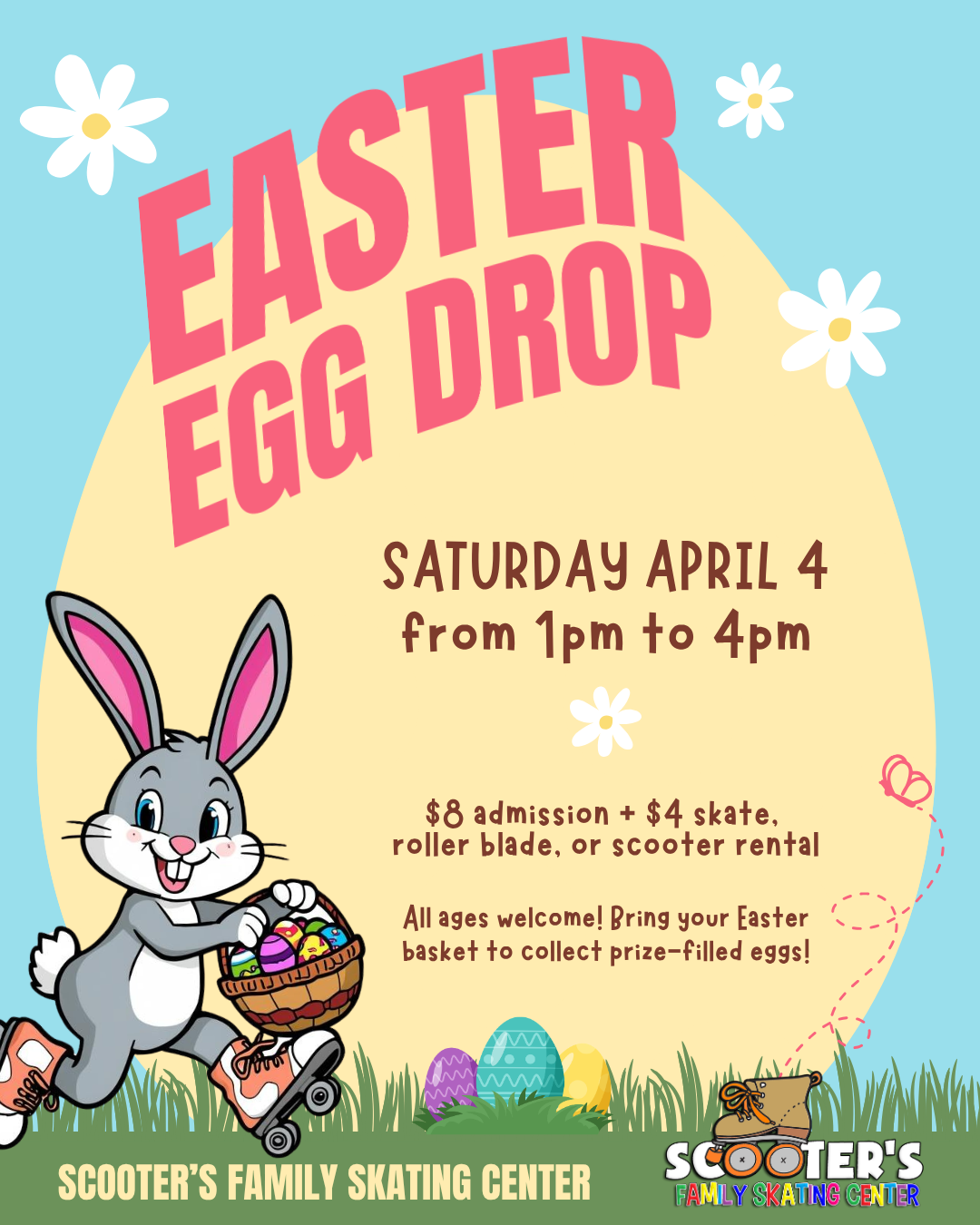 Join us on Saturday April 4 from 1-4pm for an Easter Egg Drop at Scooter’s Skating Center! All ages are welcome!