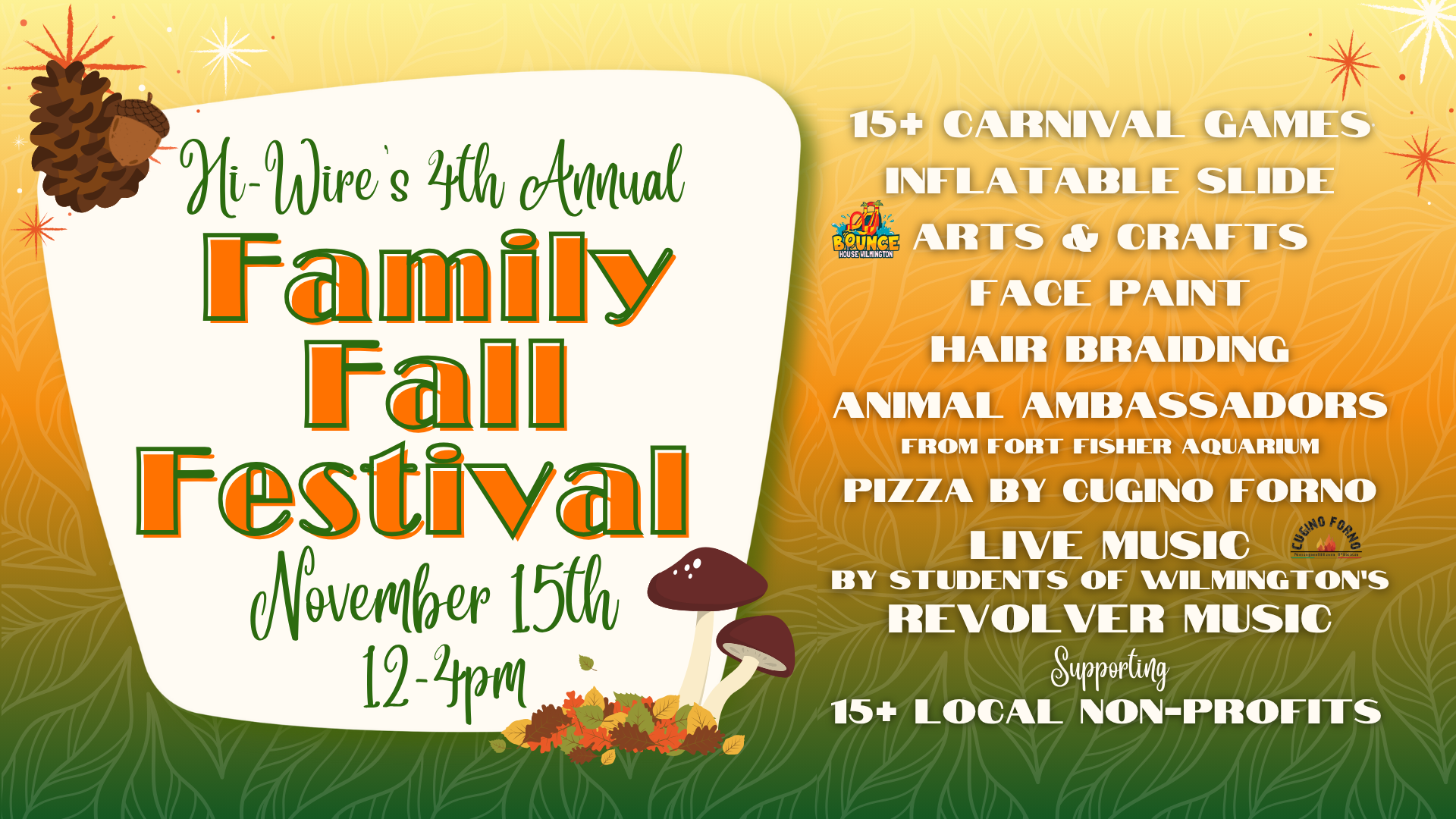 Join us for Hi-Wire Brewing Wilmington’s 4th Annual Family Fall Festival on Saturday, November 15th from 12–4pm. This fun-filled afternoon is all about celebrating fall, supporting local non-profits, and bringing the community together.