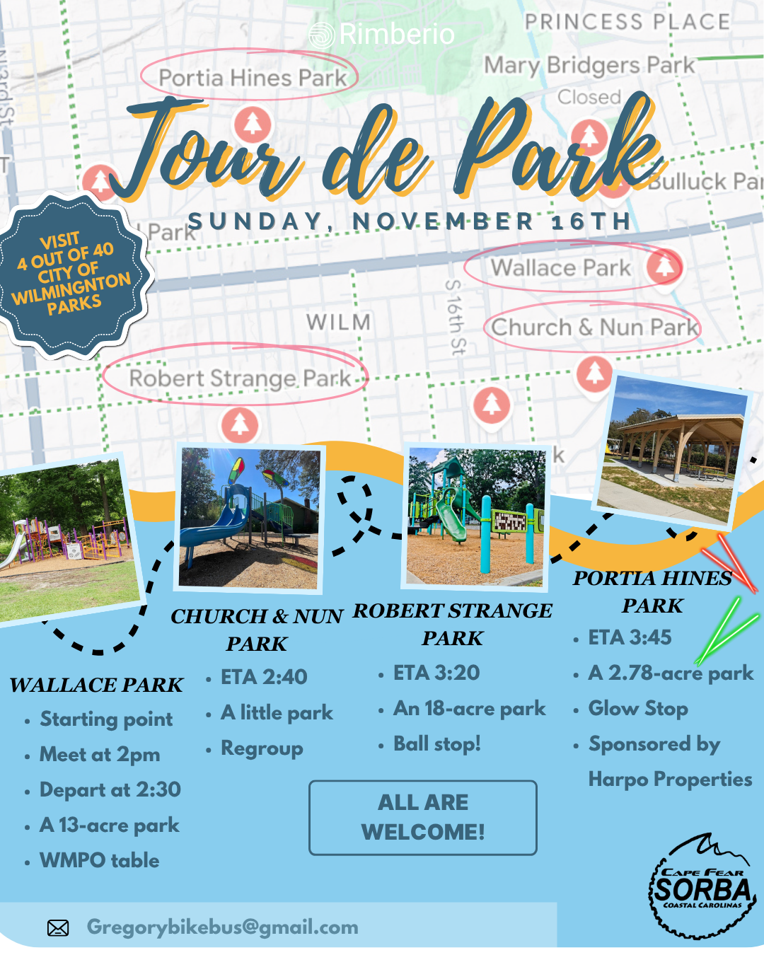 wallace Park 2710 Market St, WilmingtonCommunity bike ride for families hosted by the Gregory Bike Bus and Sorba. Meet at Wallace park at 2pm (kickstands up at 2:30) and stop by 3 more parks on the way to Cugino Forno! The entire loop is around 4 miles, perfect for all levels of riders! WMPO will have a table at Wallace […]