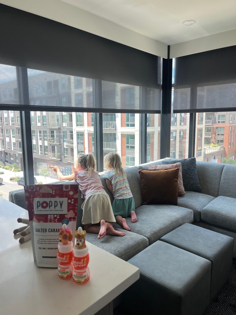 There’s also a good amount of space. We had a decent size living room with a view of downtown and pullout sofa, so the kids could crash there. The baby had her own nook for the pack-n-play and we still had our own bedroom and space to relax.