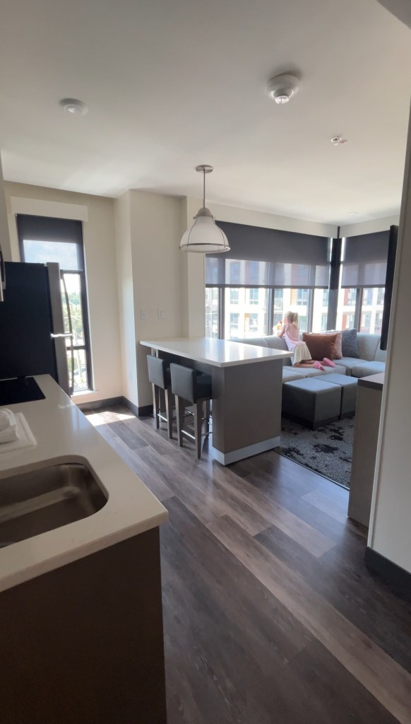 We booked a family suites which comes with a full kitchen. We had a fridge, coffee maker, cooktop, microwave, dishes—basically everything we needed to keep snacks cold and make quick meals. You know, when you’re traveling with picky eaters or toddlers who suddenly need a snack right now, that kitchen is gold.