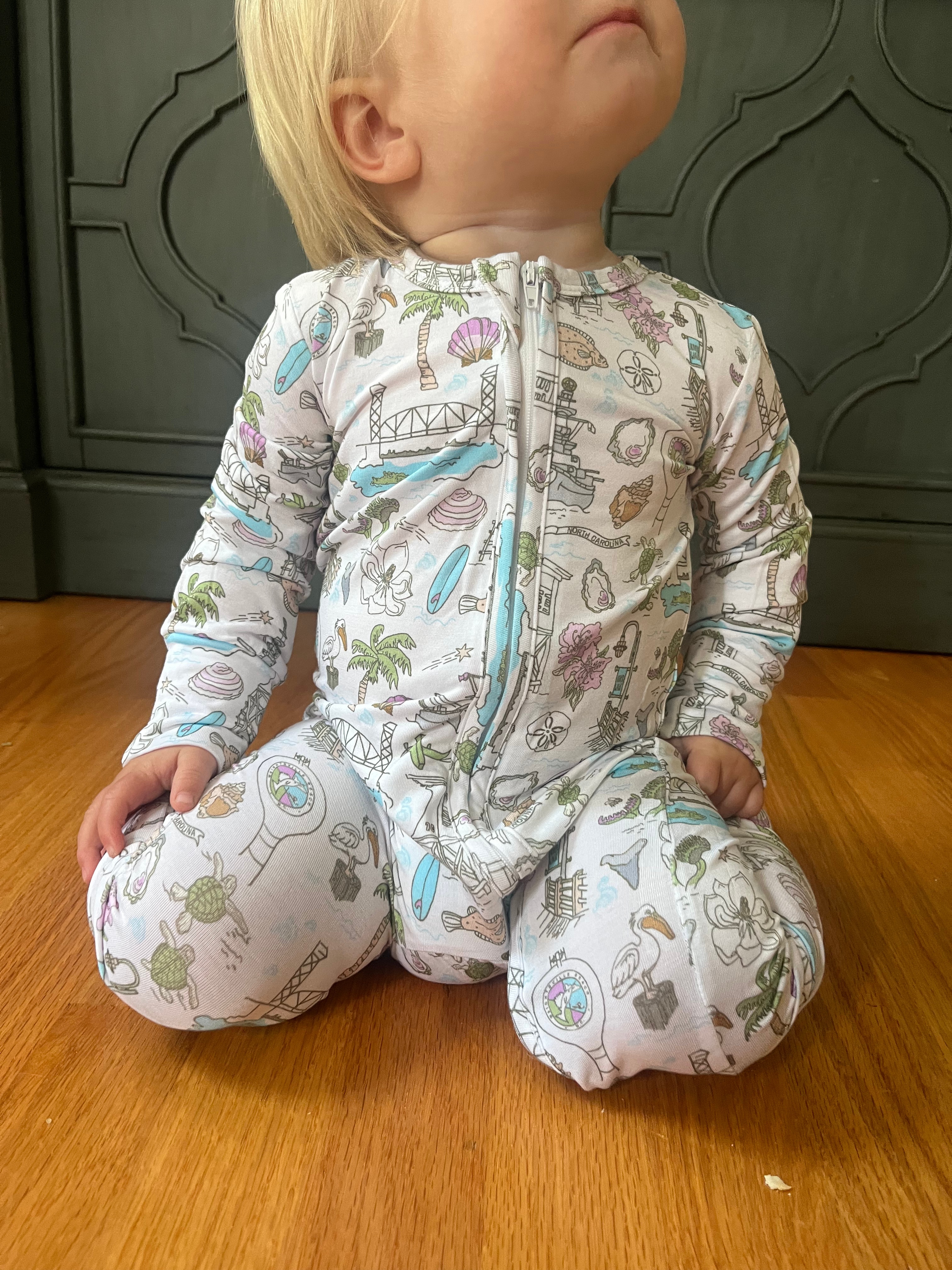 Bring home a piece of the Carolina coast with our exclusive Wilmington-inspired pajamas. This limited-edition print is a love letter to our vibrant seaside city, featuring iconic local landmarks, colorful azaleas, palm trees, seashells, and all the beachy charm you know and love. Designed locally by artist Amy Layton, it’s the perfect keepsake for locals and visitors alike.